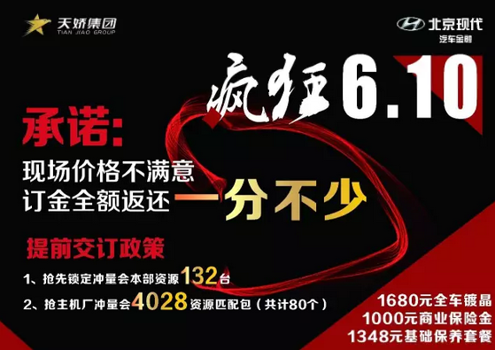 天嬌集團特批75萬現(xiàn)金,北京現(xiàn)代提供132臺廠方本部資源 —— 廠方承諾:‘只要銷量,不談價格’現(xiàn)場價格不滿意