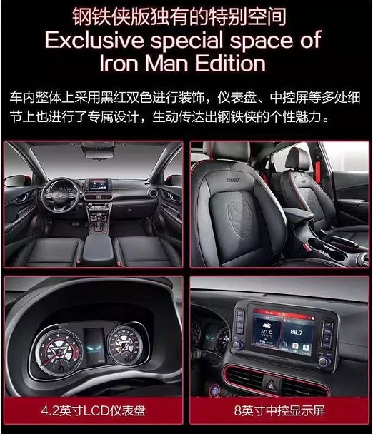 在產(chǎn)品設(shè)計上,昂希諾 鋼鐵俠版的車身采用雙色調(diào)設(shè)計,配有鋼鐵俠專屬以太紅和鈦金灰飾面,多處細(xì)節(jié)加入IRONMAN及MARVEL字樣,重新設(shè)計的車身前部酷似面具,獨特的日間行車燈形似鋼鐵俠犀利的雙眼。車內(nèi)采用紅黑雙色裝飾,液晶儀表盤中融入鋼鐵俠頭盔啟動效果,生動傳達(dá)出鋼鐵俠的個性魅力。
