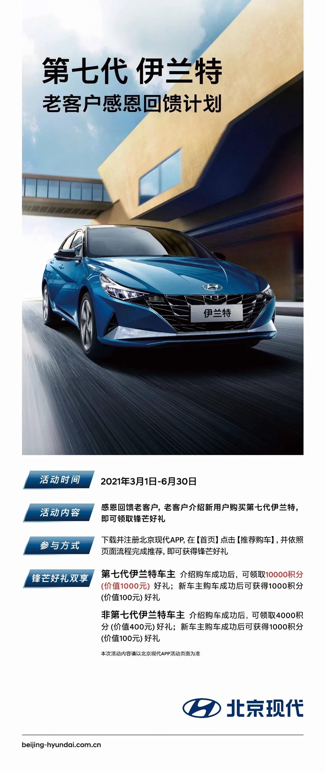 尊敬的第七代伊蘭特車主,您好!為回饋廣大客戶的長期支持,現(xiàn)推出“第七代伊蘭特老客戶感恩回饋計劃”,通過北京現(xiàn)代 APP 推薦好友成功購買第七代伊蘭特(第七代伊蘭特車主)推薦可得 10000 積分(價值 1000 元)被推薦人可得 1000 積分(價值 100 元)