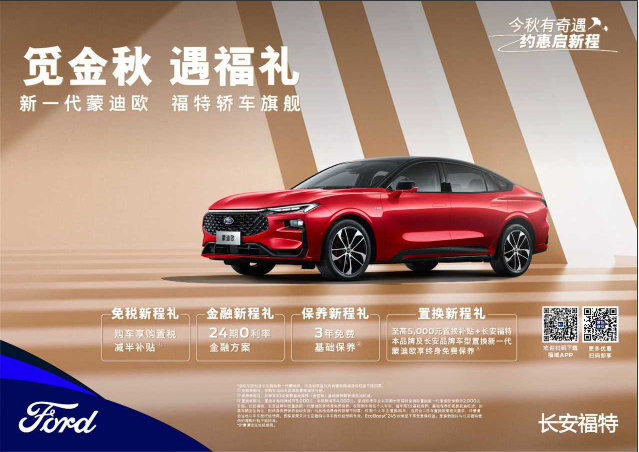 置換新程禮:至高5,000元置換補(bǔ)貼+長(zhǎng)安福特本品牌及長(zhǎng)安品牌車型置換新一代蒙迪歐享