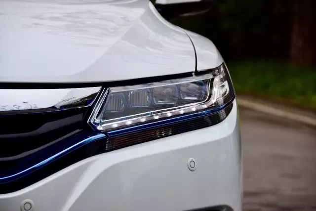 沿襲Honda家族飛翼式前臉造型,相較汽油版,新思鉑睿銳·混動(dòng)的進(jìn)氣格柵特意增加了混動(dòng)車型專屬的藍(lán)色飾條。藍(lán)色接近天空的顏色,正好將混動(dòng)車環(huán)保的特性凸顯出來(lái),而晶鉆式全LED前大燈由于藍(lán)色描邊的點(diǎn)綴,看起來(lái)也比汽油版的更富科技感。