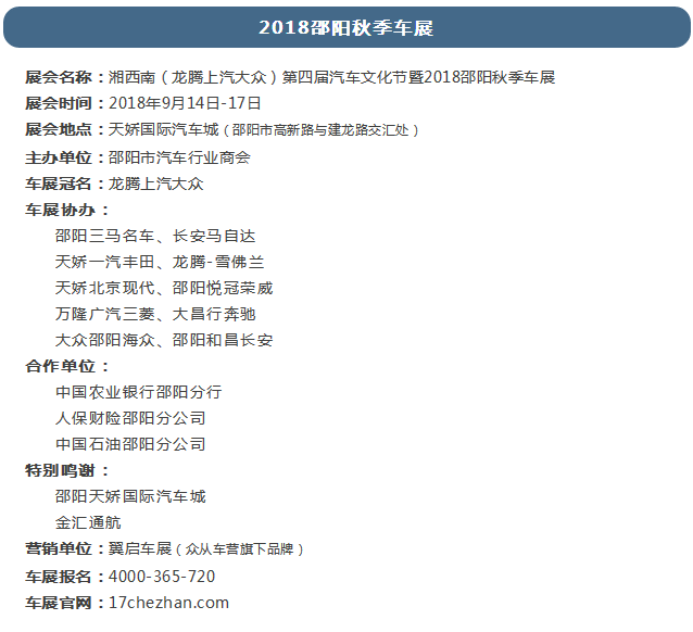 湘西南(龍騰上汽大眾)第四屆汽車文化節(jié)暨2018邵陽秋季車展將于2018年9月14日-17日在邵陽市天嬌國際汽車城舉辦。