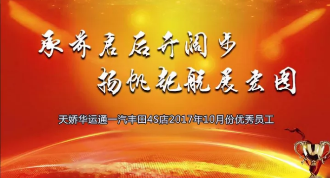 銀色的十月已過去,輝煌的十一月悄然來臨,時間晃晃而過已是2017年11月11日,天嬌華運通一汽豐田4S店每月一次的總結(jié)優(yōu)秀員工表彰大會如期而至。