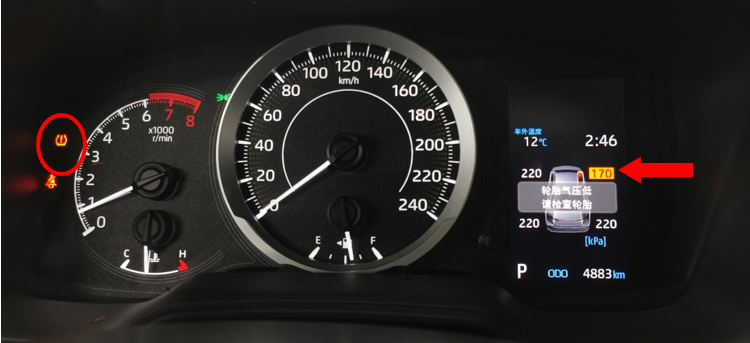 如果啟動車輛時發(fā)現(xiàn)胎壓燈點(diǎn)亮,首先查看儀表顯示的胎壓數(shù)值,略低于180kPa時,可低速行駛至就近的一汽豐田經(jīng)銷店檢查確認(rèn)。