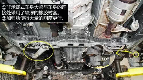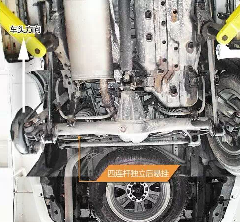 車身大梁中部有加強(qiáng)肋,大大提高了剛度,大梁與車身的連接處使用了較厚的橡膠襯套,慮振效果較好。油箱有金屬蓋板保護(hù),上面有導(dǎo)流槽以及通風(fēng)孔,有利于氣流快速通過并且?guī)ё邿崃?。 中央差速器帶差速鎖,為托森限滑差速器類型。 后為開放式差速器,不帶差速。前后減震支柱均為日本制造。