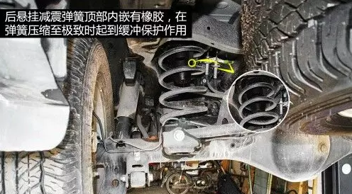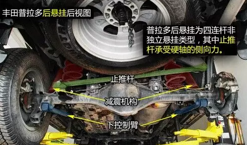普拉多后四連桿結(jié)構(gòu)帶止推桿,止推桿一頭連接在車身上,一頭連接到硬軸上,承受硬軸的側(cè)向力作用,上下控制臂則承受車輪的上下跳動(dòng)力。后懸掛減震彈簧頂部內(nèi)嵌有橡膠,在彈簧壓縮至極致時(shí)起到緩沖保護(hù)作用。