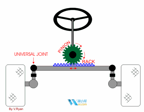 轉(zhuǎn)動(dòng)轉(zhuǎn)向盤時(shí),可帶動(dòng)小齒輪轉(zhuǎn)動(dòng),這個(gè)小齒輪與一條齒條相吻合,帶動(dòng)齒條左右直線運(yùn)動(dòng),并推動(dòng)轉(zhuǎn)向輪左右擺動(dòng),從而實(shí)現(xiàn)轉(zhuǎn)向功能。齒輪不是簡(jiǎn)單的平齒輪,而是特殊的螺旋形狀,這可改善轉(zhuǎn)向時(shí)的柔順感。